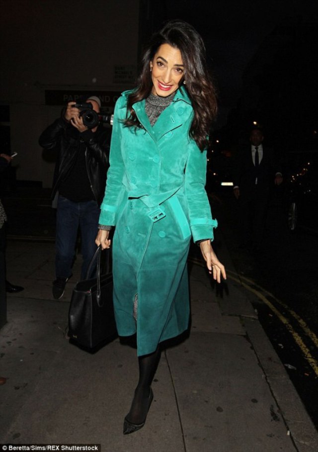 Ετσι, εξηγεί, ότι με αυτή την καμπαρτίνα η Αμάλ φορούσε ένα φόρεμα «DOLCE & GABBANA Grey Virgin Wool Turtleneck Dress», αξίας $1,995 λιρών.