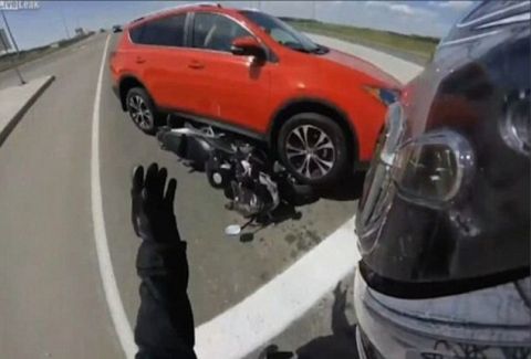 Ο αναβάτης της μηχανής ήταν σχεδόν βέβαιος πως… θα σταματήσει, καθώς αυτό υπαγορεύει η κοινή λογική. Όμως, καμία λογική δεν ήταν αρκετή για να συγκρατήσει την απρόσεκτη γυναίκα οδηγό του κόκκινου Volvo που σταμάτησε μόνο όταν έβαλε κυριολεκτικά «από κάτω» τη μαύρη μηχανή.