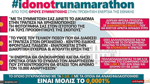 Η Εθνική Τράπεζα έχει ξεκινήσει μια φιλανθρωπική εκστρατεία μέσω του διαδικτυακού hashtag #irunmarathon. Μοιάζει εξαιρετική προσπάθεια, εκτός αν διαβάσει κανείς τα ψιλά γράμματα στους όρους συμμετοχής.