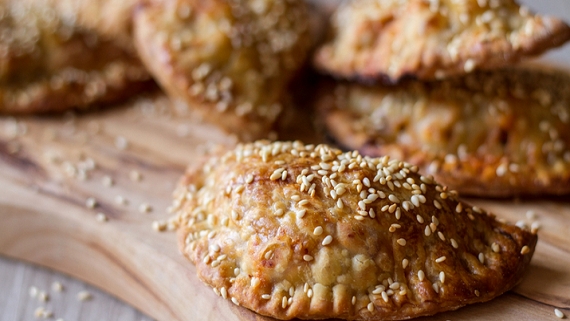 - Χτυπάμε ένα κρόκο με λίγο νερό και περνάμε τις πίτες από πάνω με ένα πινέλο και πασπαλίζουμε με σουσάμι.