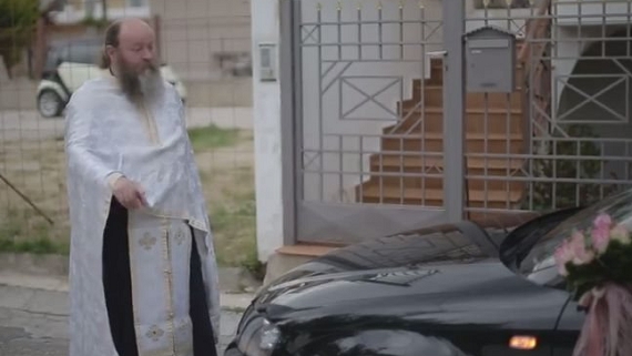 Την ενόχληση του παπά Γιώργη προκάλεσε η καθυστέρηση της νύφης, η οποία επέμενε να κάνει γύρους με το στολισμένο αυτοκίνητο γύρω από την εκκλησία.