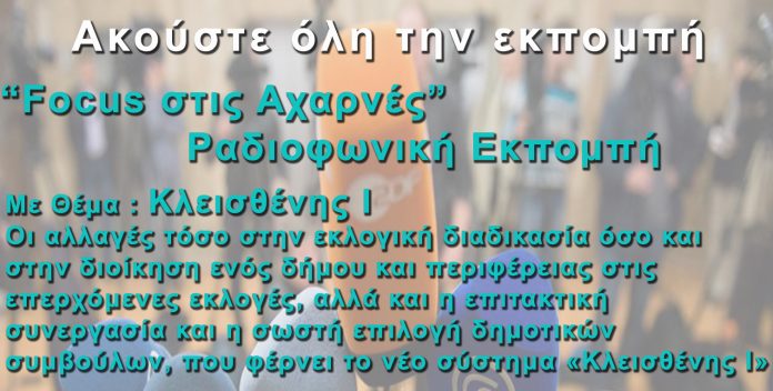 Οι αλλαγές τόσο στην εκλογική διαδικασία όσο και στην διοίκηση ενός δήμου και περιφέρειας στις επερχόμενες εκλογές, αλλά και η επιτακτική συνεργασία και η σωστή επιλογή δημοτικών συμβούλων, που φέρνει το νέο σύστημα «Κλεισθένης Ι» , απασχόλησε την εκπομπή της Focus Media Group, την Τετάρτη 27 Φεβρουαρίου στις 16:00.