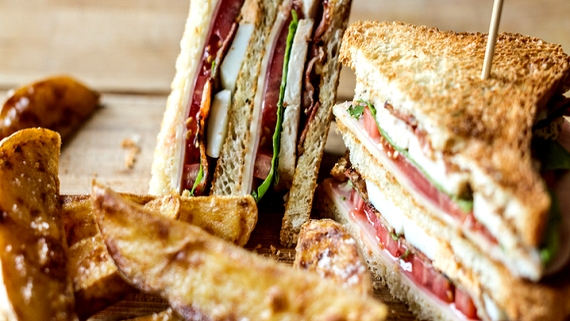 - Παίρνουμε μία φρυγανισμένη φέτα ψωμί του τοστ και απλώνουμε ένα μέρος της μαγιονέζα στην επιφάνεια. Από πάνω βάζουμε 1 φέτα τυρί και 1 φέτα ζαμπόν, το μπέικον, 2 φέτες κοτόπουλο, το μαρούλι, τη ντομάτα. Παίρνουμε άλλη μία φέτα ψωμί του τοστ την οποία αλείφουμε και από τις 2 πλευρές με μαγιονέζα και τη βάζουμε πάνω από τη ντομάτα. Από πάνω βάζουμε 1 φέτα τυρί, 1 φέτα ζαμπόν, 1 αυγό που έχουμε κόψει, ντομάτα, μαρούλι και μπέικον. Καλύπτουμε με την 3η φέτα που έχουμε αλείψει από την κάτω πλευρά με μαγιονέζα.