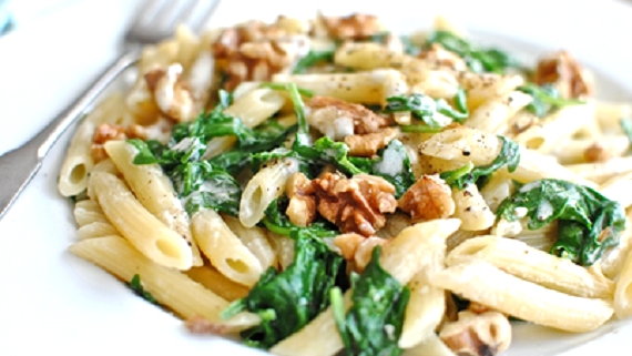 - Την αφήνουμε για 2 λεπτά περίπου ώστε να δέσει και συμπληρώνουμε 3/4 φλιτζανιού τσαγιού καρύδια ψιλοκομμένα, μισό φλιτζάνι τσαγιού παρμεζάνα και φρεσκοτριμμένο πιπέρι και ανακατεύουμε καλά.