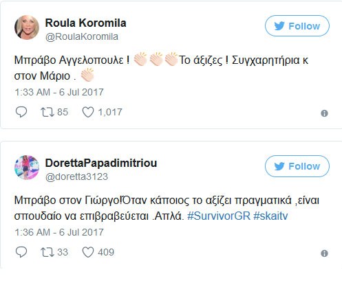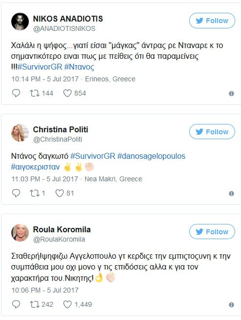 Την κρίσιμη βραδιά του μεγάλου τελικού του Survivor Greece 2017 αρκετοί ήταν οι celebrities που τον υποστήριξαν ανοιχτά κατά τη διάρκεια της live μετάδοσης και πανηγύρισαν όταν ο Σάκης Τανιμανίδης ανακοίνωσε πως ο Γιώργος Αγγελόπουλος είναι ο μεγάλος νικητής του Survivor!