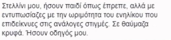Λίγες ώρες αργότερα επανήλθε με νέα δημοσίευση «Στελλίνι μου, ήσουν παιδί όπως έπρεπε, αλλά με εντυπωσίαζες με την ωριμότητα του ενηλίκου που επιδείκνυες στις ανάλογες στιγμές. Σε θαύμαζα κρυφά. Ήσουν οδηγός μου»