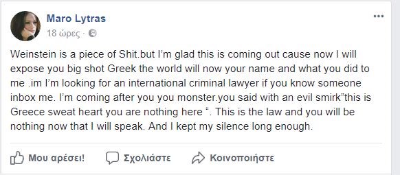 «Ο Γουάνστιν είναι ένα απόβρασμα. Είμαι, όμως, χαρούμενη που αυτή η ιστορία ήρθε στο φως γιατί τώρα θα σε εκθέσω σε όλους, Έλληνα. Ο κόσμος θα μάθει το όνομά σου και τι έκανες σε εμένα. Ψάχνω έναν δικηγόρο διεθνούς ποινικού δικαίου.