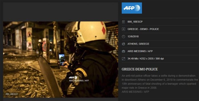 Σε μια ανάπαυλα των εκτεταμένων επεισοδίων που έλαβαν χώρα μετά το τέλος της πορείας για τα 10 χρόνια από τη δολοφονία του Αλέξανδρου Γρηγορόπουλου, αστυνομικός αποφάσισε να τραβήξει φωτογραφία τον εαυτό του.