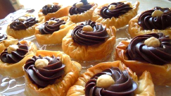 8) Βράζουμε τα υλικά για το σιρόπι 5 λεπτά περίπου και περιχύνουμε τις φωλίτσες αφού χλιάνουν λίγο. Μόλις κρυώσουν τα γεμίζουμε τα μισά με την Ganache και τα μισά με την λευκή σοκολάτα