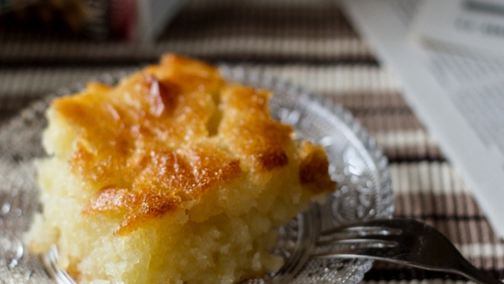 - Βουτυρώνουμε με το υπόλοιπο βούτυρο ένα ταψί 27 x 37 εκ. και ρίχνουμε το μείγμα.